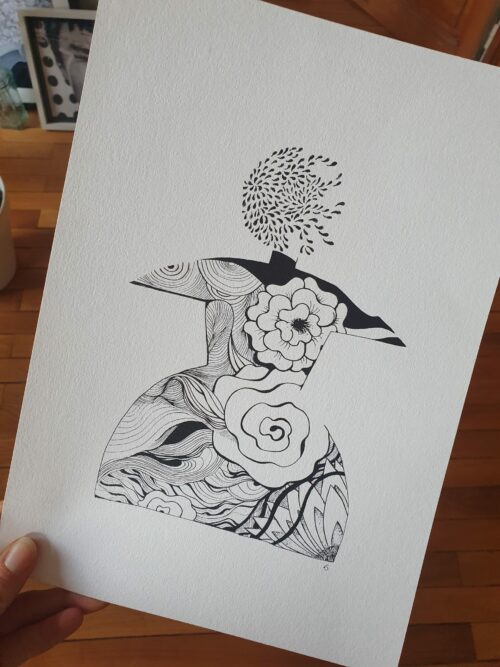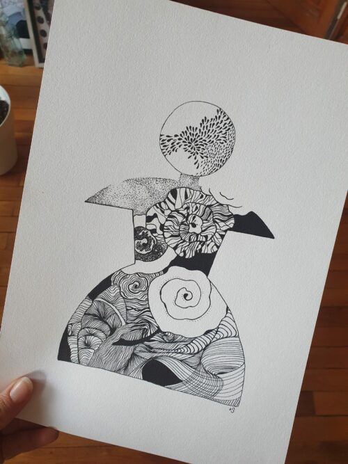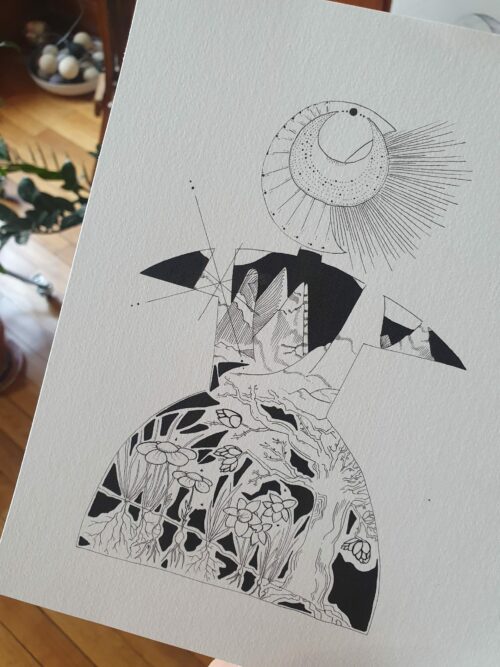 Chaque illustration est portée par des intentions, des ressources, un poème, un exercice, ou un extrait de texte écrit intuitivement en méditation ou en dialogue avec mon âme. Elle est surtout « en devenir ». C’est vous, en la choisissant, qui la rendez unique et personnelle. En posant votre regard sur votre illustration affichée dans votre bureau, sur le frigo, à côté de votre lit,… elle vous aide à ancrer en profondeur le message dont vous avez besoin, une ressource importante pour vous, pour votre projet, votre cheminement. Elle devient une amulette, un objet d’ancrage, un soutien, un rappel.